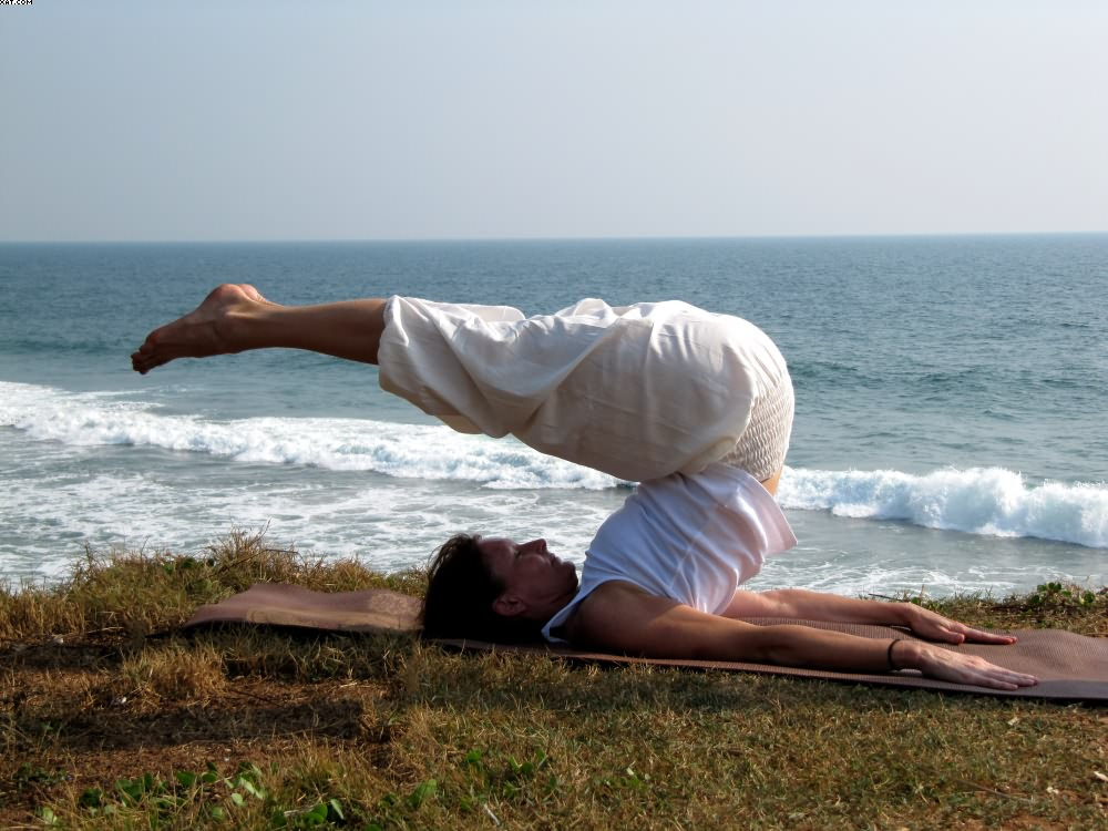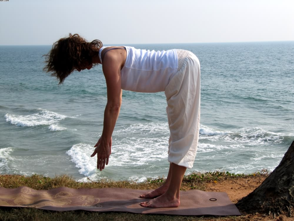 Atme tief durch den Mund ein und vollständig durch die Nase aus. Verlangsame deine Atmung soweit, daß du nur noch 3 mal pro Minute atmest. Halte die Arme durchgedrückt und die Achseln gestreckt.