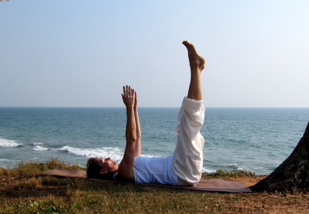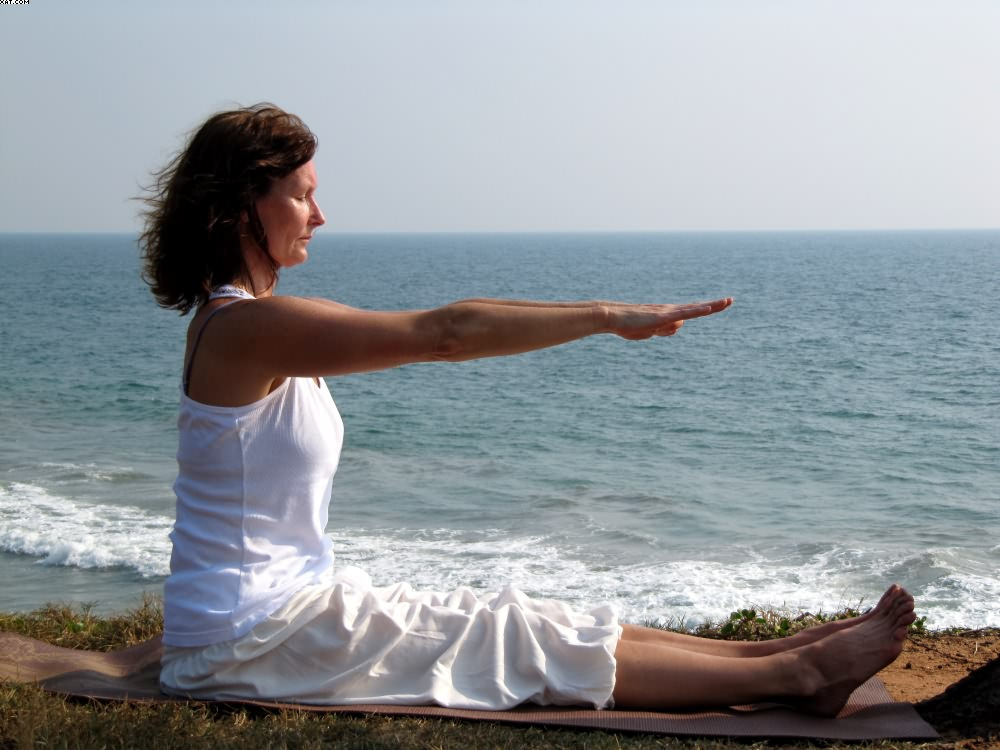 Atme tief durch den Mund ein und vollständig durch die Nase aus. Verlangsame deine Atmung soweit, daß du nur noch 3 mal pro Minute atmest. Halte die Arme durchgedrückt und die Achseln gestreckt.